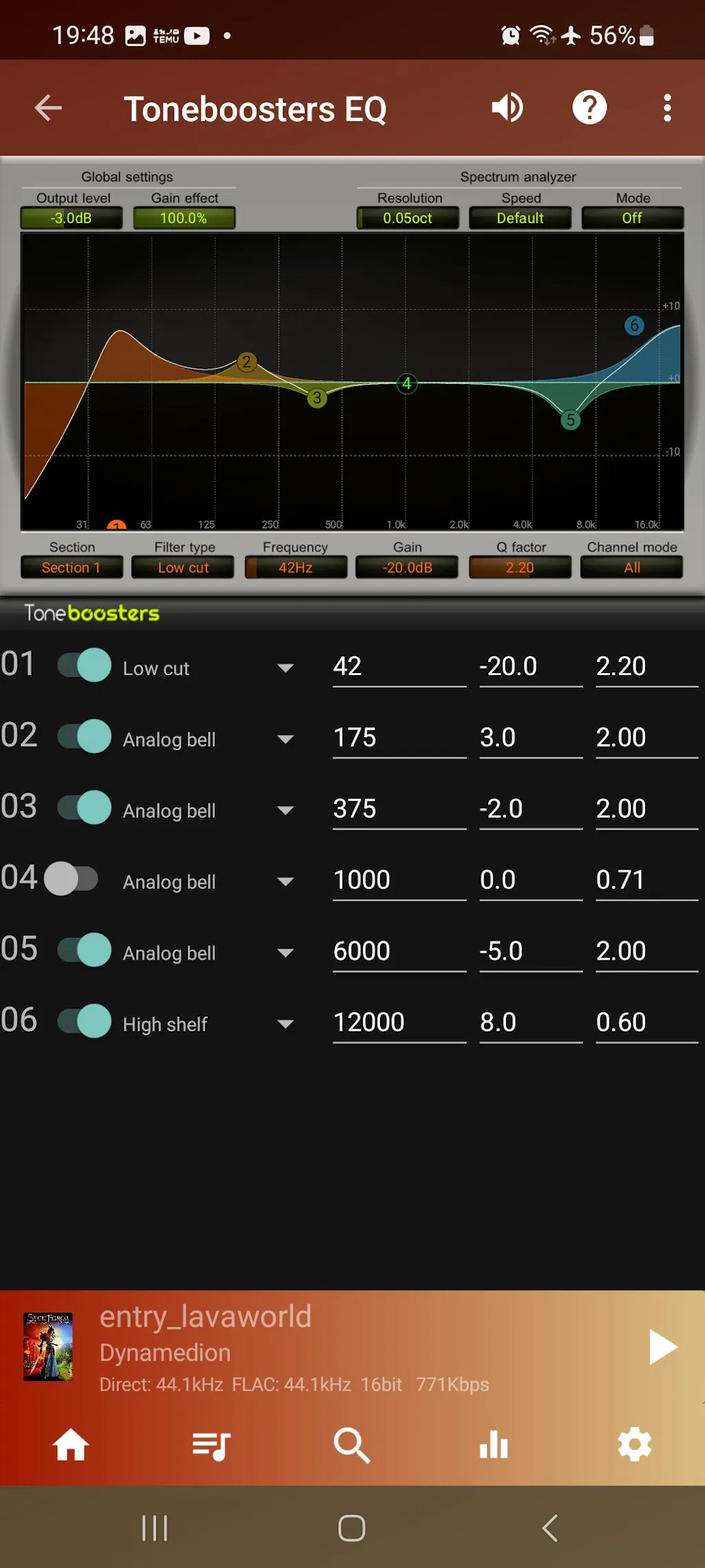 As you can see in my EQ settings, I lowered the overall Output Level by –3.0 dB. Without this, in some loud tracks at peak moments, the player’s engine may clip due to boosted frequencies in EQ. Lowering the output level by –3 dB also reduces the maximum volume of the headphones, but for home listening this reduction will still provide enough volume.