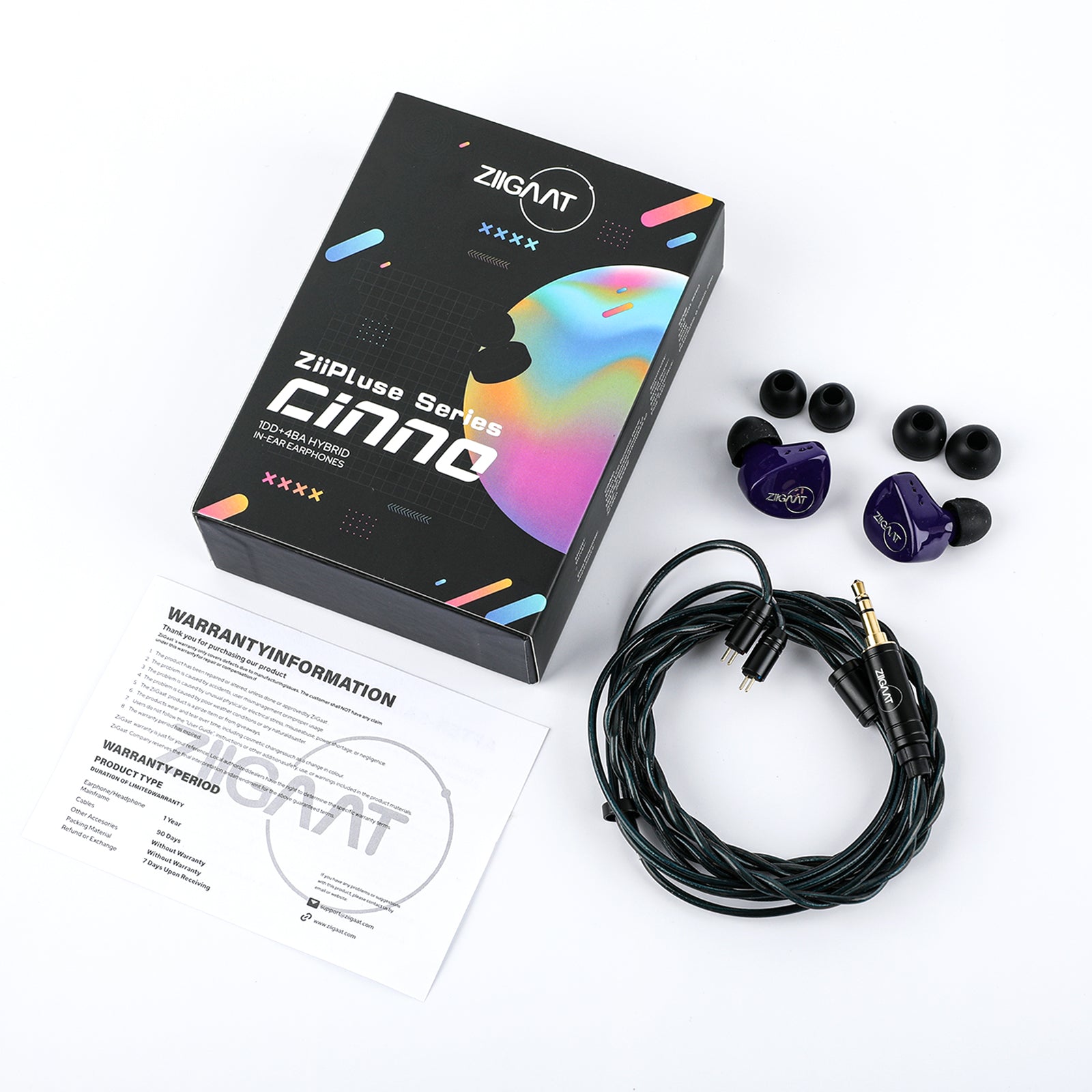 The ZiiGaat Cinno is a hybrid in-ear monitor featuring a 10mm Liquid Crystal Polymer dynamic driver for powerful bass and four balanced armature drivers for optimal audio quality, meticulously tuned for a balanced tonal signature, and designed with a tiny, ergonomic shape for comfortable and extended listening sessions.